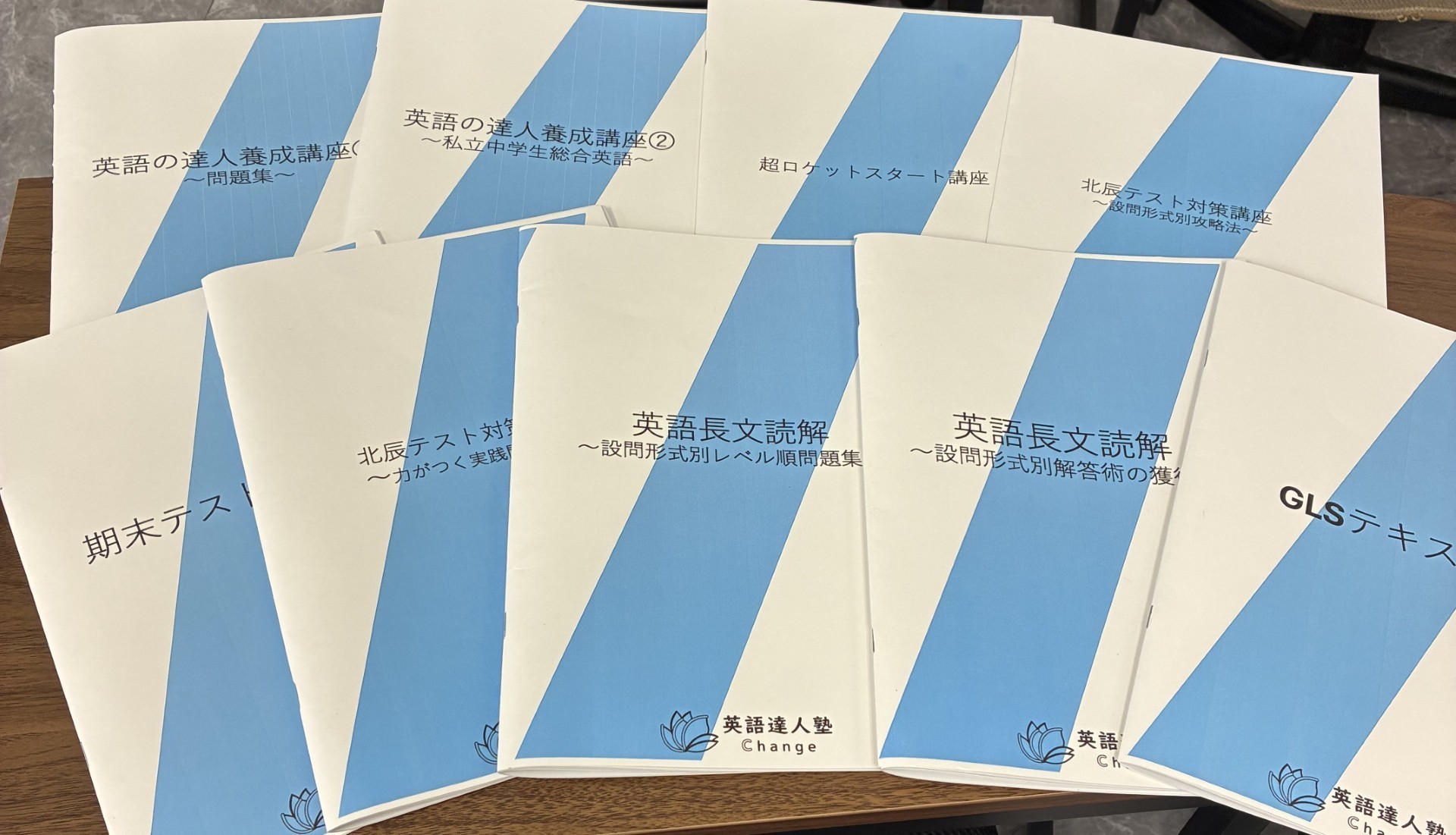 はじめはもともとあった文法の教材の再設計から始めたが、さらに磨きがかかったテキストを作ることができた。それから北辰テストの分析を行い各大問ごとの分析を行い、大問ごとの攻略法をテキストにまとめ、さらにそれに準拠した問題集を作成した。「楽しすぎる」仕事だ。まだ生徒がいない段階で一人で黙々と作り、いつか来るだろう生徒に見せた時に、喜んでもらうことを夢見て、ひたすらにテキストを作っていた。それから、中学英語を学年ごとにまとめたテキスト、中高一貫中学生用のテキスト、リスニング用のテキスト等2か月の間に10冊以上作った。
