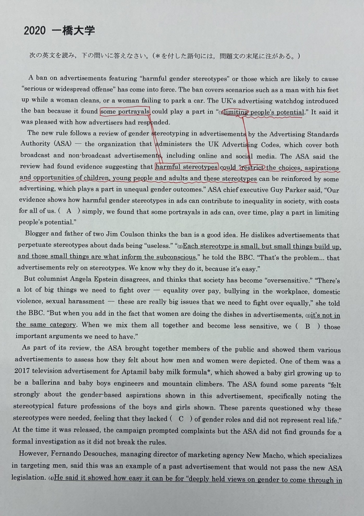 4行目にあるlimiting people's potentialに下線が引かれていて、これを50字以内で説明する問題。この文の主語はsome portrayalsであり、9行目のharmful stereotypesに言い変わっている。つまり主語が共通している。それに動詞のristrictと下線部のlimitingも同義であることを考えると目的語も共通していることがわかる。したがって、people's potential(人間の潜在意識)はthe choices~adultsに言い変わっているとわかる。ここを使って解答すれば、問1はクリア。