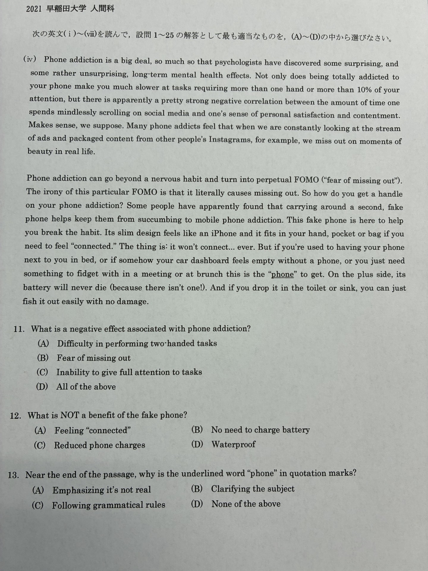 設問11:先に設問を見て、何を読み取れば解けるのか確認しておこう。ここではphone addictionとnegetive effectをチェックしておこう。「スマホ中毒の悪影響」が何なのか読み取ればいい。ここで選択肢のDに着目してほしい。あまり見られない選択肢だろう。All of the avobe「上記の全て」。つまりAとBとCすべてが当てはまるという意味で、この人科の問題ではおなじみの選択肢である。3行目のmore than one「1つより多い手」→「両手」のところでAとCが当てはまる。最終文でBも当てはまるので、答えはDである。