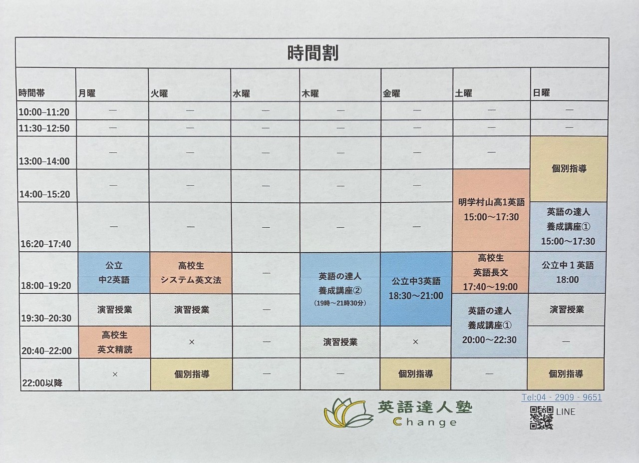 「―」の部分はまだ未定な状態です。オンラインや個別指導の対応可能な時間です。